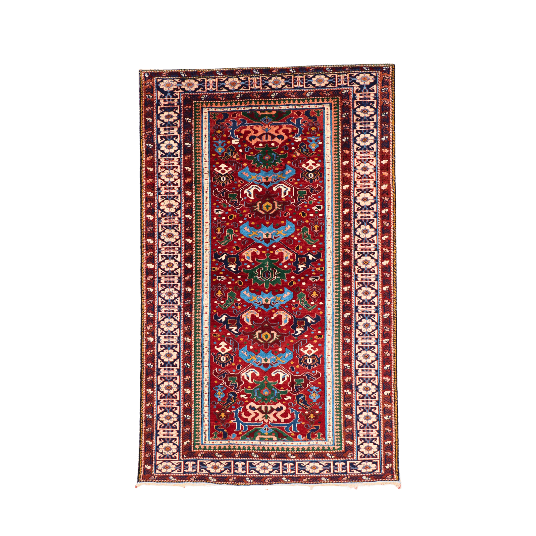 Crafted on a wool foundation with a wool pile, the rug employs symmetrical (Turkish) knotting, a method associated with Caucasian weavings. This technique ensures crisp outlines and a durable construction suitable for daily foot traffic. The use of vegetable-based dyes—extracted from regional plants, roots, and minerals—produces the rug’s lively yet harmonious color scheme. Over time, these dyes develop subtle tonal variations (abrash), adding depth and individuality to each piece. The mid-20th-century production date places it in an era when local weavers still upheld many of the region’s traditional methods, even as external influences began shaping design preferences.