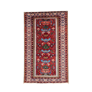 Measuring 4’9″ x 8′, the rug features a tribal aesthetic characterized by a rich interplay of geometric and stylized floral forms. The central field, rendered in red and salmon, is populated by angular medallions and minor motifs in blue, green, yellow, and navy—a vibrant palette typical of Kuba’s expressive weaving tradition. Each motif is precisely arranged to maintain visual rhythm, showcasing the artisan’s skill in balancing color and form. A multi-tiered border frames the composition, with narrower guard borders flanking a main border that may include meandering vines, small rosettes, or latch-hook designs. This structured framing underscores the rug’s cohesive layout and accentuates the central patterns.
