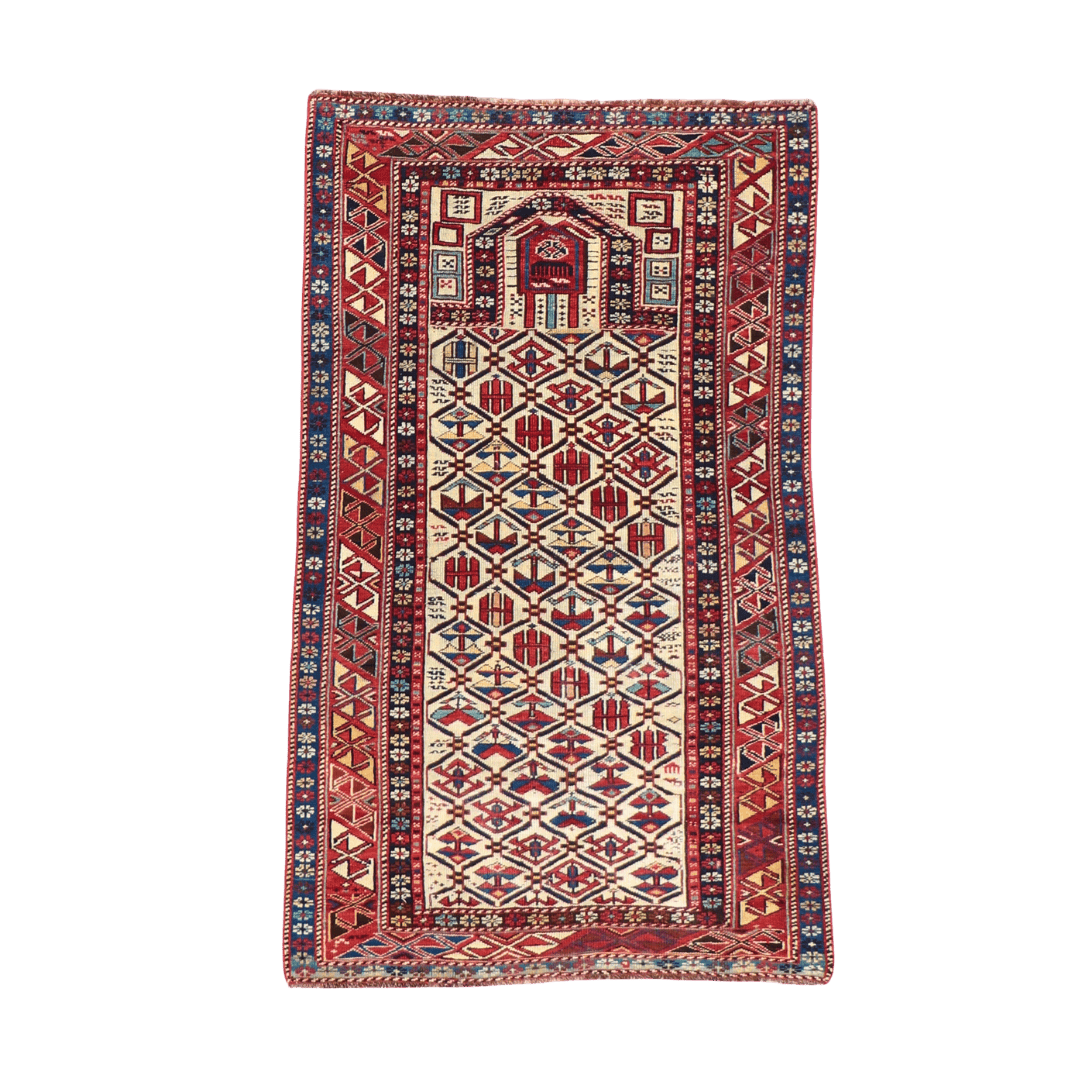 The center field of the rug is a symphony of geometric and organic forms. The patterns arranged in a rhythmic sequence across the field, create a visual flow that draws the eye along the rug’s narrow dimensions (3′ x 4’7″). Complementing the central design, the border is equally detailed, featuring a repeating sequence of geometric tribal motifs and carnations—that frame the central field with precision and balance. The harmonious integration of the central medallion pattern with its ornate borders is a distinctive characteristic of traditional Caucasian and Persian heritage rugs.