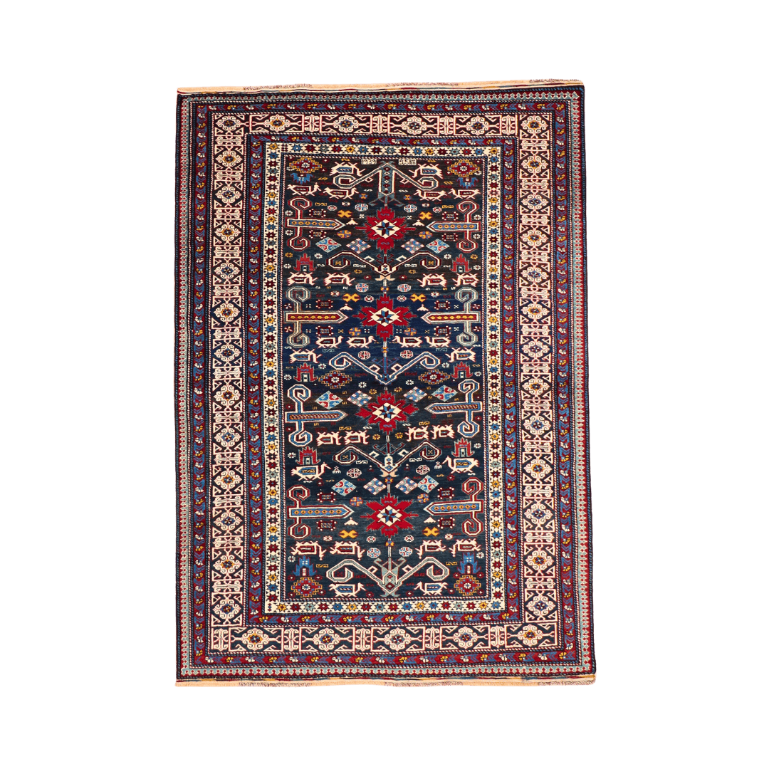 Constructed on a wool foundation with a wool pile, the rug employs symmetrical (Turkish) knots, known in the region for providing clarity of design and resilience under foot traffic. The use of vegetable-based dyes—sourced from local plants and minerals—lends a naturally variegated quality (abrash) to the colors, enhancing the rug’s artisanal character. Despite being woven in 1939, it retains the traditional weaving methods and dyeing processes passed down through generations of Caucasian weavers.