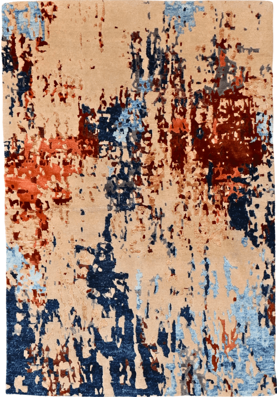 Crafted on a robust cotton foundation, this rug features a luxurious pile made from a blend of wool and silk, providing both durability and a soft, plush feel underfoot. The color scheme is a sophisticated mix of beige, rust, navy, and sky blue, presenting a canvas that captures the abstract beauty of contemporary art. The beige background acts as a neutral base, allowing the colors to stand out, making it a focal point in any setting.